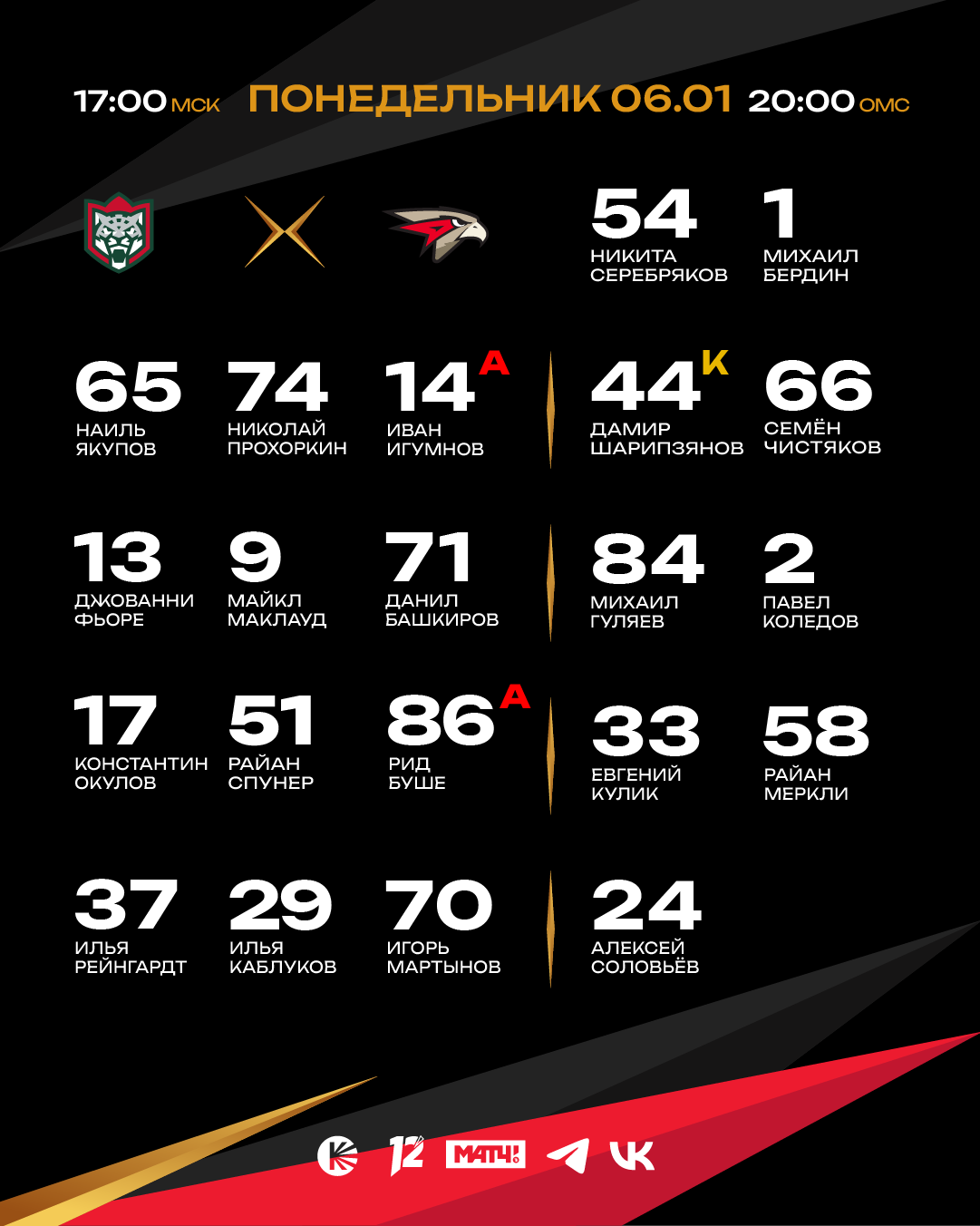 Состав «Авангарда» на выездной матч против «Ак Барса»