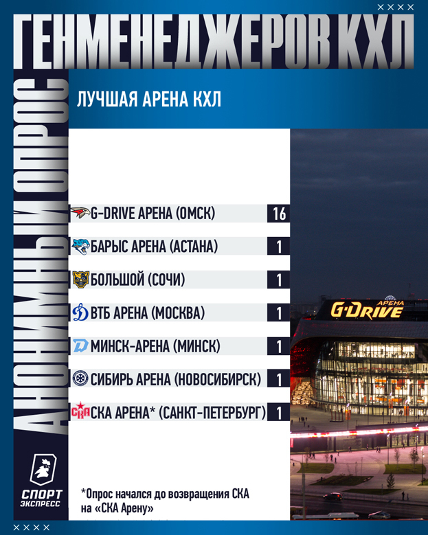 «Спорт-Экспресс» подвёл итоги голосования среди руководителей клубов КХЛ. Новенькая и невероятно роскошная арена омичей по праву считается чуть ли не лучшим крытым спортивным сооружением страны. Потому ее первенство в глазах менеджеров неоспоримо. Голосуй все они прямо сейчас, возможно, их мнение было бы другим. Однако СКА вернулся на ультрасовременную одноименную арену относительно недавно, и далеко не все сумели оценить ее.