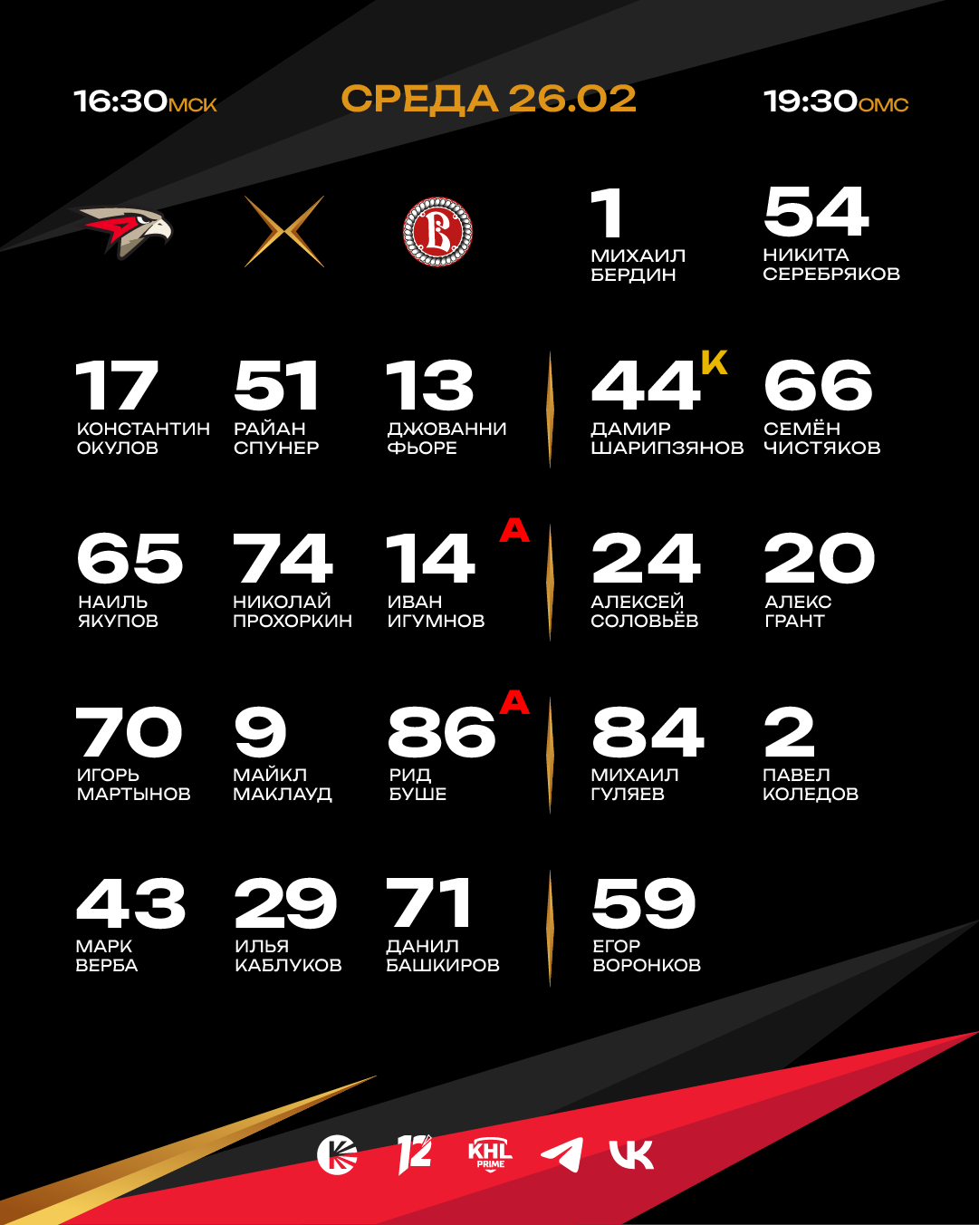 Встреча на G-Drive Арене начнётся в 19:30 по омскому времени (16:30 по московскому времени). Прямую трансляцию смотрите в эфире телеканала KHL Prime и омского «12 канала».