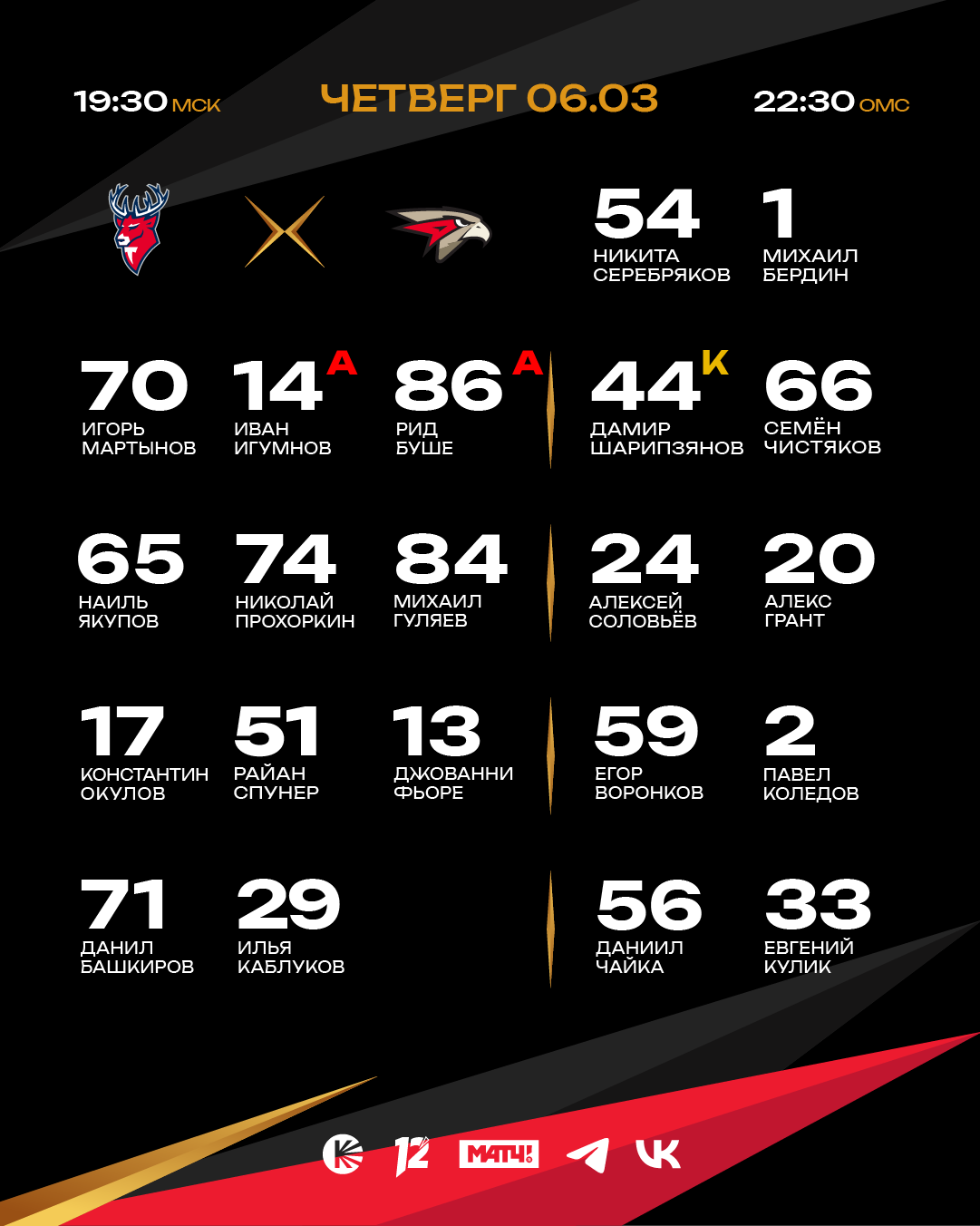 Встреча в Нижнем Новгороде начнётся в 22:30 по омскому времени (19:30 по московскому времени). Прямую трансляцию смотрите в эфире «Матч ТВ» и омского «12 канала».