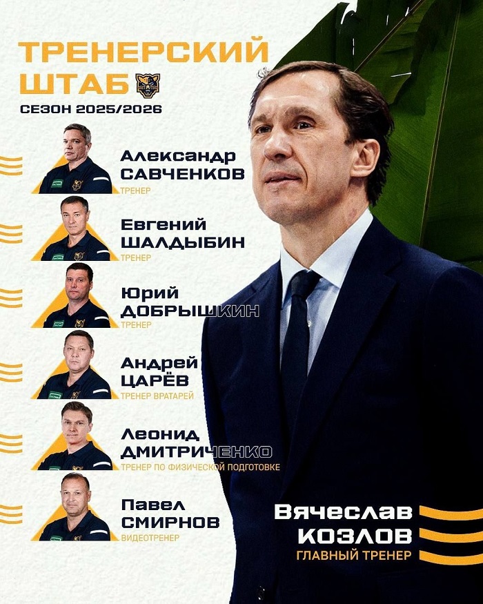 Пресс-служба ХК «Сочи» представила тренерский штаб команды на сезон-2025/2026. Главным тренером является Вячеслав Козлов.
