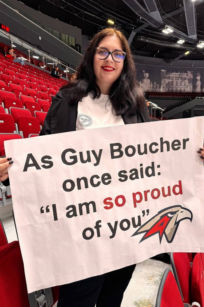 Тренировка «ястребов» была открытой. Увидеть вживую любимую команду пришли в основном те, кто родился и жил в Омске, переехал, но душой и сердцем остался с «Авангардом». Омичка Екатерина Добровольская 10 лет как петербурженка. В «Юбилейный» девушка пришла с плакатом, на котором цитата главного тренера: «Я вами очень горжусь».
