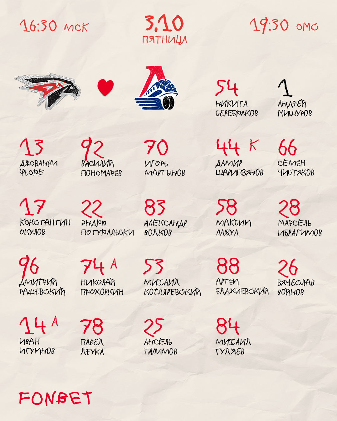 Состав «Авангарда» на домашний матч против «Локомотива»