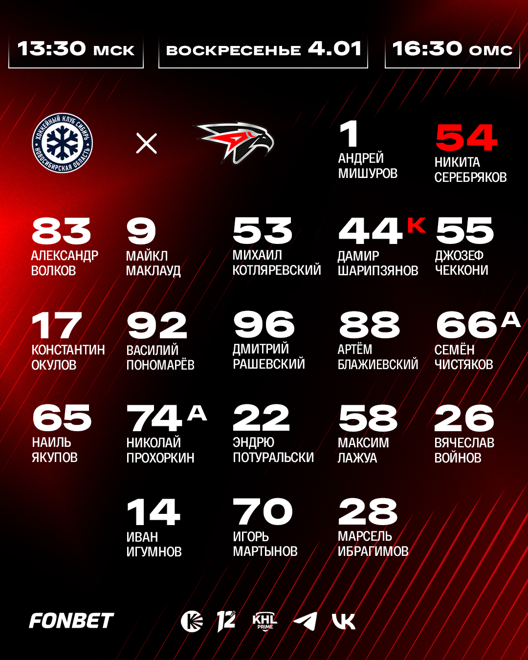 Состав «Авангарда» на выездной матч против «Сибири»