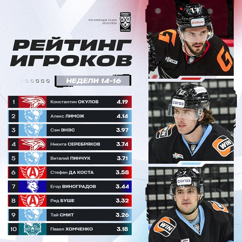 Константин Окулов возглавил рейтинг игроков КХЛ сезона 2025/2026