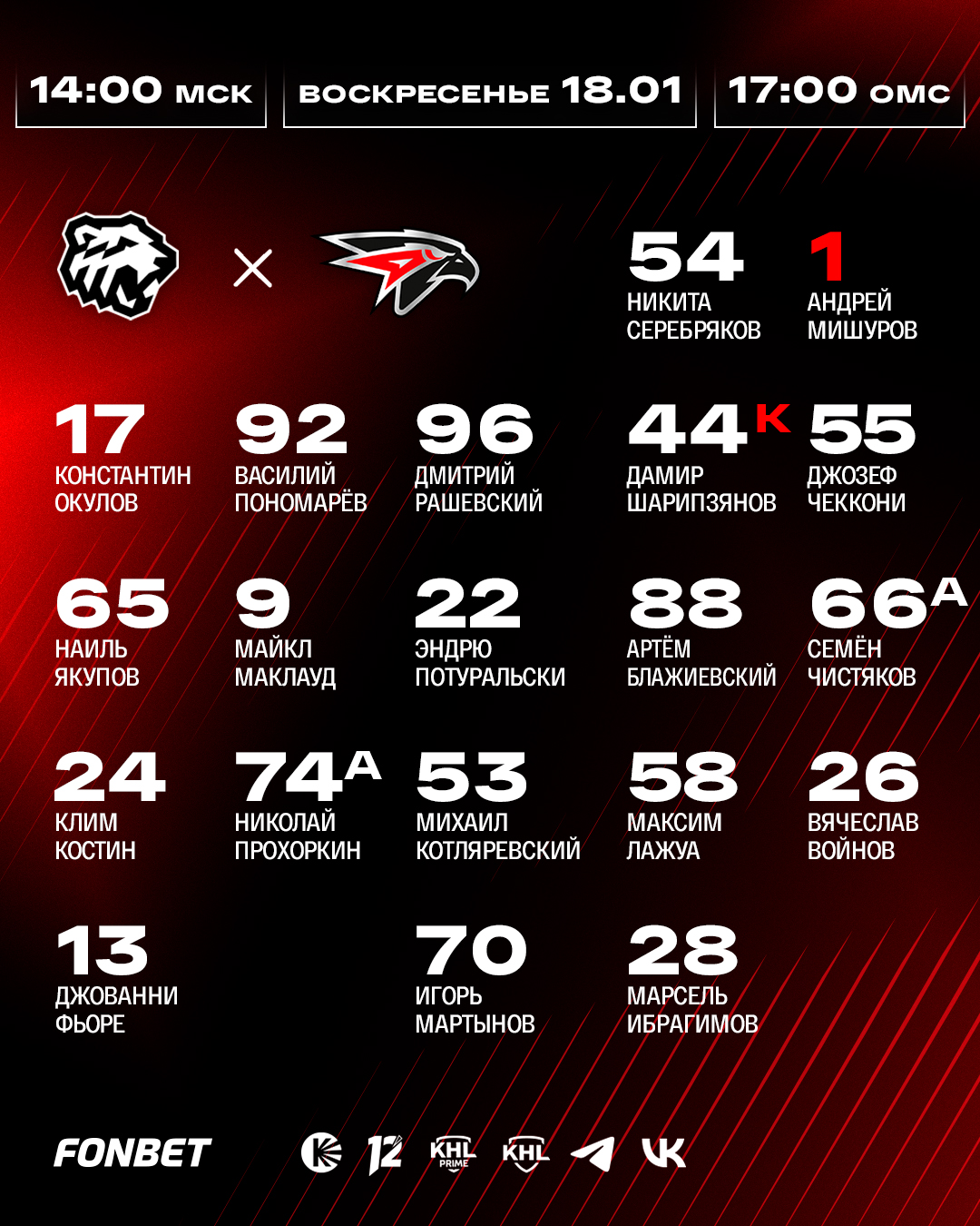 Встреча в Челябинске начнётся в 17:00 по омскому времени (14:00 по московскому времени). Прямую трансляцию смотрите в эфире телеканалов KHL, KHL Prime, омского «12 канала» и на «Кинопоиске» по подписке «Яндекс Плюс».