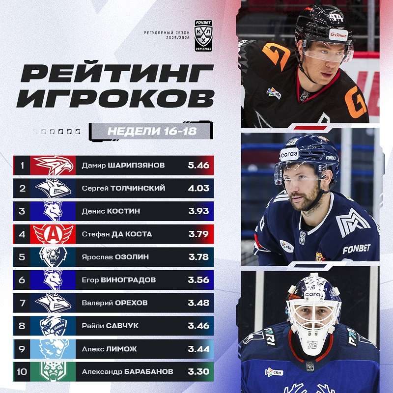 Дамир Шарипзянов возглавил рейтинг игроков КХЛ сезона 2025/2026