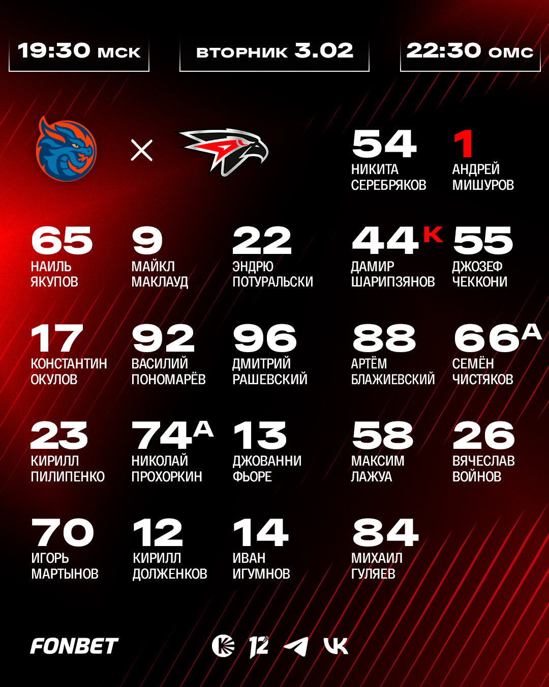 Состав «Авангарда» на выездной матч против «Драконов»