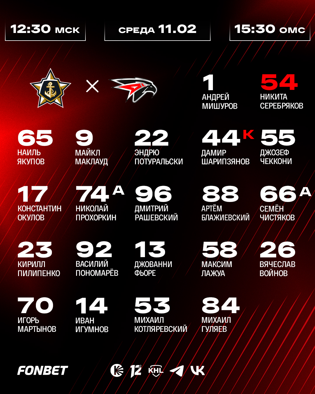 Встреча во Владивостоке начнётся в 15:30 по омскому времени (12:30 по московскому времени). Прямую трансляцию смотрите в эфире телеканала KHL, омского «12 канала» и на «Кинопоиске» по подписке «Яндекс Плюс».