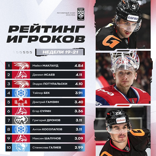 Майкл Маклауд возглавил рейтинг игроков КХЛ сезона 2025/2026, Потуральски - третий