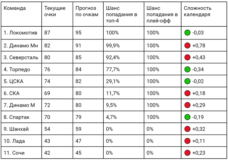 Ещё один момент – преимущество домашней арены. Опять же, калибровка показала, что преимущество своего льда в КХЛ даёт +0,74 шайбы к разнице счёта. Наконец к этим данным мы прибавили показатель Strength of Schedule (SoS) – сложность календаря. Модель считает средний рейтинг всех будущих соперников, а после проводит 10 тыс. симуляций оставшихся матчей. Далее выводится средний прогноз – это и есть готовые результаты.
