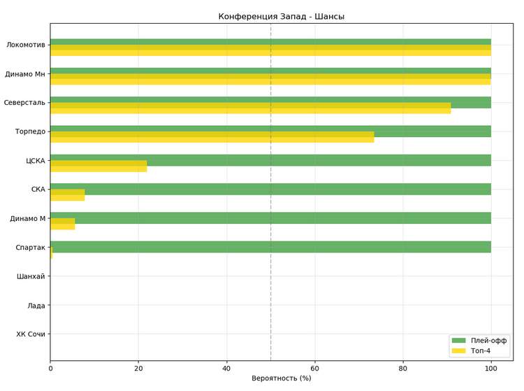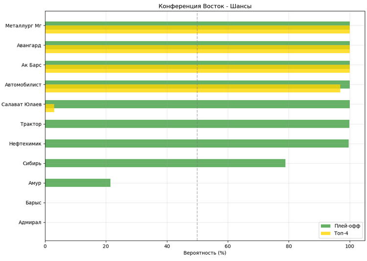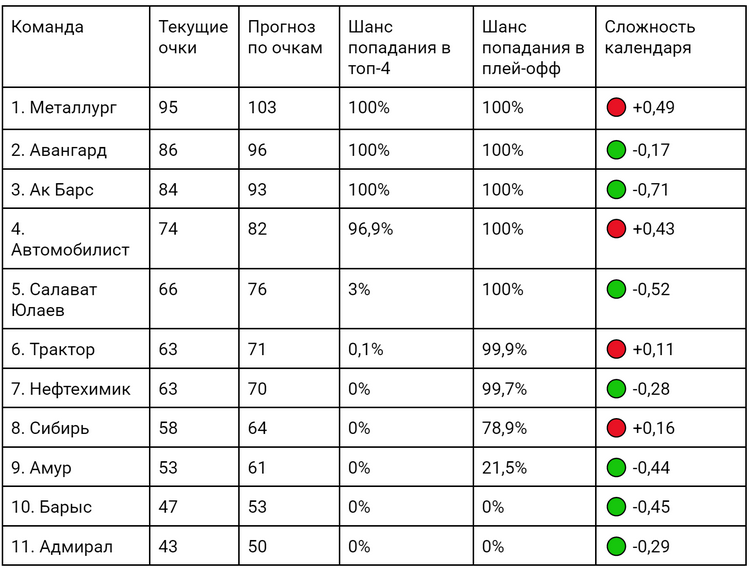 Если бы плей-офф стартовал завтра, то соперником «Ак Барса» по первому раунду стал бы «Трактор»: команды занимают третью и шестую строчки Востока. Модель считает, что обе команды останутся на своих местах. Учитывая текущую форму, «Ак Барс» наберёт ещё девять очков и завершит регулярный чемпионат на третьем месте, «Трактор» возьмёт восемь очков и останется на шестой строчке.