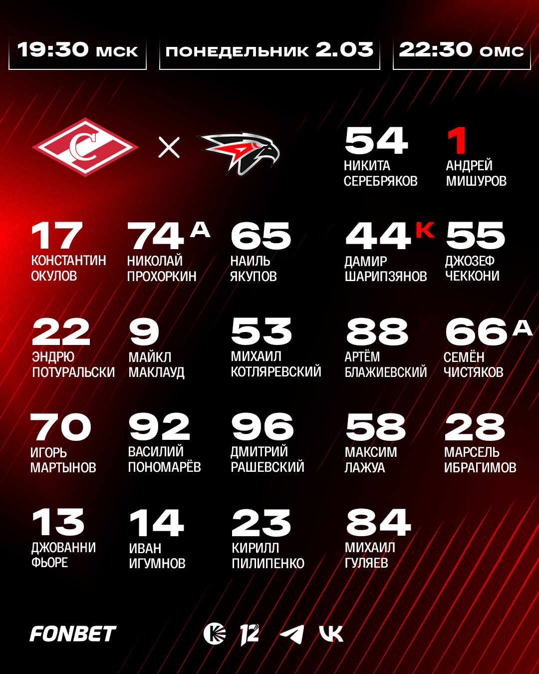 Состав «Авангарда» на выездной матч против «Спартака»