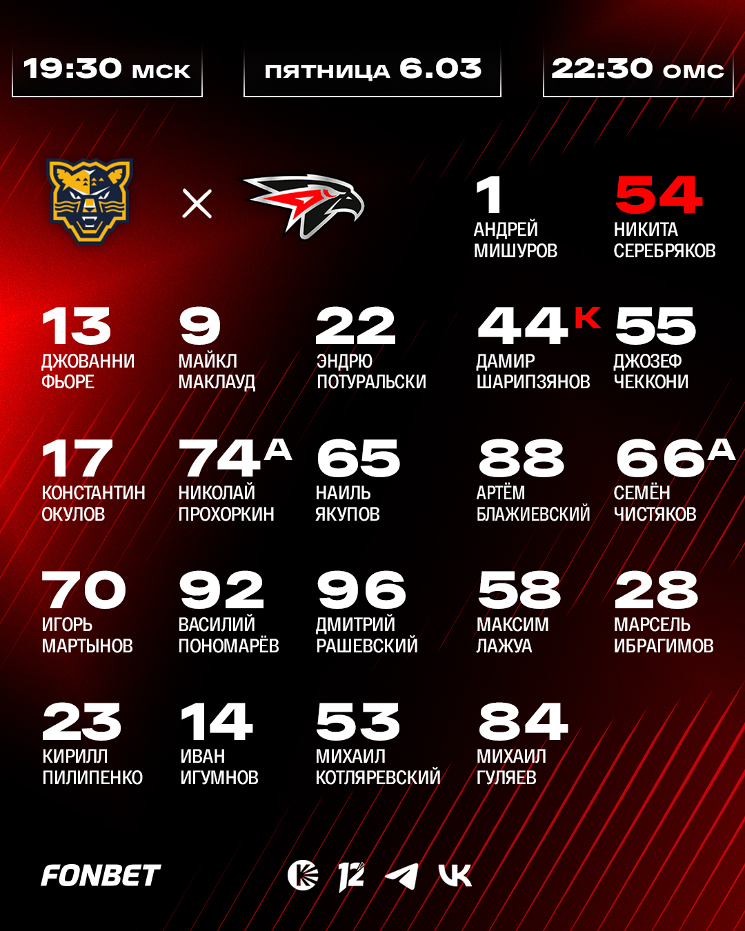 Начало встречи в 22:30 по омскому времени (19:30 по московскому времени). Прямую трансляцию смотрите в эфире телеканалов KHL, KHL Prime, омского «12 канала» и на «Кинопоиске» по подписке «Яндекс Плюс».