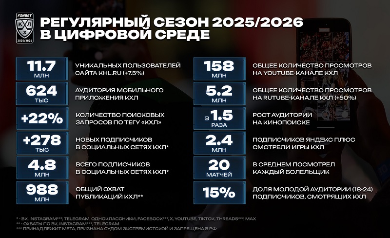 С 5 сентября 2025 года по 20 марта 2026 года онлайн-кинотеатр Кинопоиск показал в прямом эфире все 748 матчей. Совокупно за ними следили 2,4 млн подписчиков Яндекс Плюса* — это в 2,2 раза выше, чем в сезоне 2023/2024 и в 1,5 раза больше, чем в прошлом сезоне. Сезон 2025/2026 уже опередил по показателям весь прошлый чемпионат КХЛ 2024/2025 с учётом плей-офф.