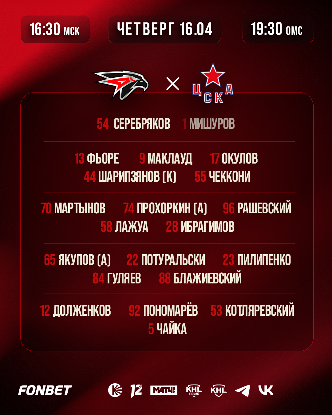 Состав «Авангарда» на пятый матч серии против ЦСКА