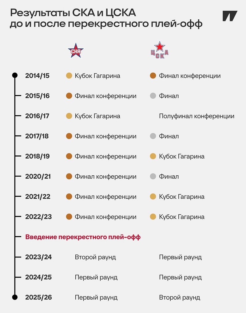 До появления перекрестного плей-офф СКА и ЦСКА 8 раз за 9 лет встречались друг с другом в финале Западной конференции, а в этом сезоне играли друг против друга в первом раунде плей-офф. Два года назад питерских армейцев ущемил восточный «Автомобилист», а в плей-офф-2026 ЦСКА взял только один матч у омского «Авангарда».