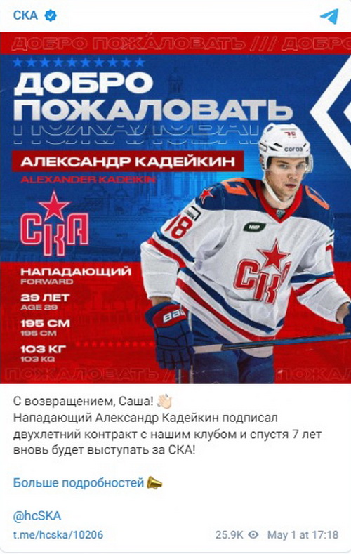 СКА подписал контракты с нападающими Александром Кадейкиным и Павлом Дедуновым. Первого специалисты называют одним из сильнейших российских центров, второй призван укрепить нижние звенья команды.
