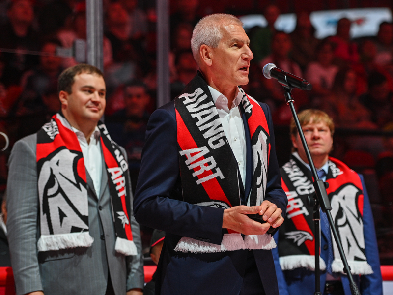После приветствия руководителя Омской области хоккейный клуб «Авангард» передал Олегу Матыцину на память ту самую именную шайбу, которая была заложена им в историческую капсулу при начале строительства многофункционального комплекса G-Drive Арена в 2020 году.