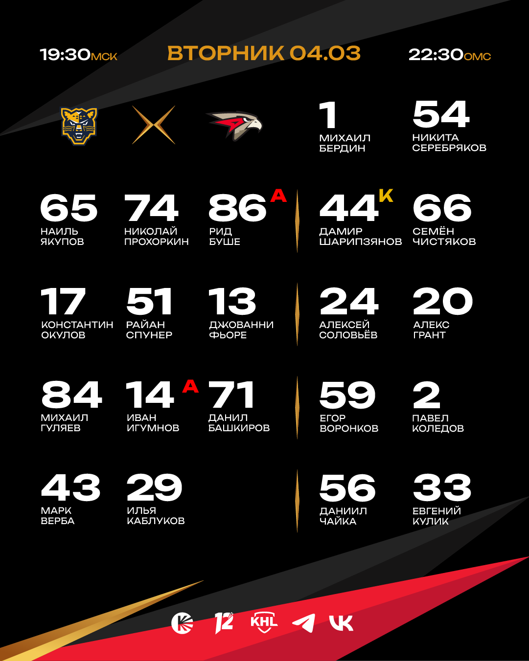 Начало встречи в 22:30 по омскому времени (19:30 по московскому времени). Прямую трансляцию смотрите в эфире телеканала KHL и омского «12 канала».