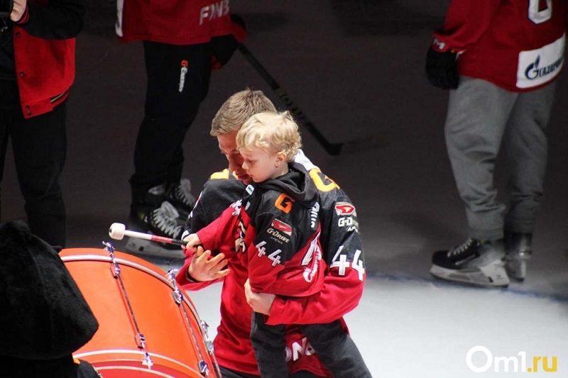 Многие хоккеисты появлялись на льду со своими детьми. Вот сын Дамира Шарипзянова пытается бить в фанатский барабан.