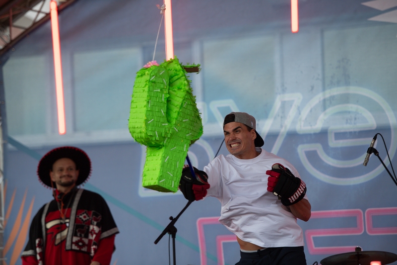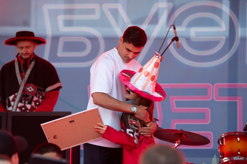 На сцене наш форвард поприветствовал собравшихся и разбил пиньяту, откуда высыпались подарки для нового конкурса.