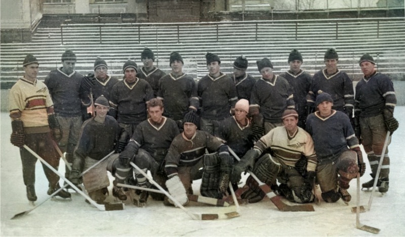 Игроки «Аэрофлота» (слева направо): Александр Власов, Леонид Щукин, Валерий Кириченко, Юрий Мальков, Сергей Дерябин, Борис Степанищев, боксер, Григорий Бердышев, Геннадий Домашкин