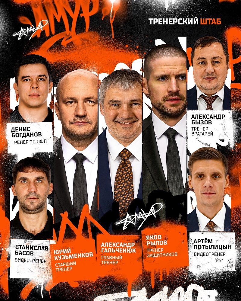 В грядущем сезоне помогать главному тренеру «Амура» Александру Гальченюку будут старший тренер Юрий Кузьменков, тренер защитников Яков Рылов, тренер вратарей Александр Бызов, тренер по физической подготовке Денис Богданов, видеотренеры Станислав Басов и Артём Потылицын.