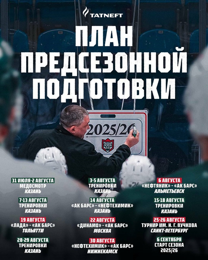 Регулярный чемпионат КХЛ сезона 2025/26 для «Ак Барса» стартует 6 сентября игрой в Магнитогорске против «Металлурга».