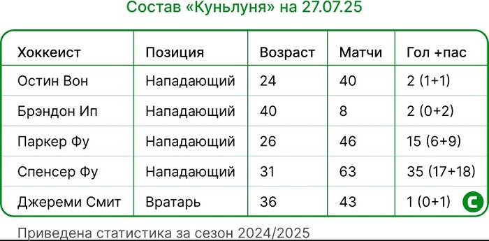 В «Куньлуне» до сих пор нет ни одного защитника. Да и два из четырех нападающих вызывают скепсис. 40-летний Брэндон Ип провел в прошлом сезоне восемь матчей и находится в команде скорее из-за восточного уважения к старшим. Да и Остин Вон с 5 (4+1) очками за два сезона не кажется хоккеистом, на которого можно сделать ставку.