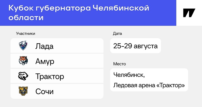 По сравнению с прошлым годом в составе участников Кубка губернатора Челябинской области не будет команды из ВХЛ. В этот раз вместо «Югры» там выступит «Сочи». Все игры состоятся на арене «Трактор» с 25 по 29 августа. Сначала все команды сыграют друг с другом, а в последний день проведут финал и матч за третье место.