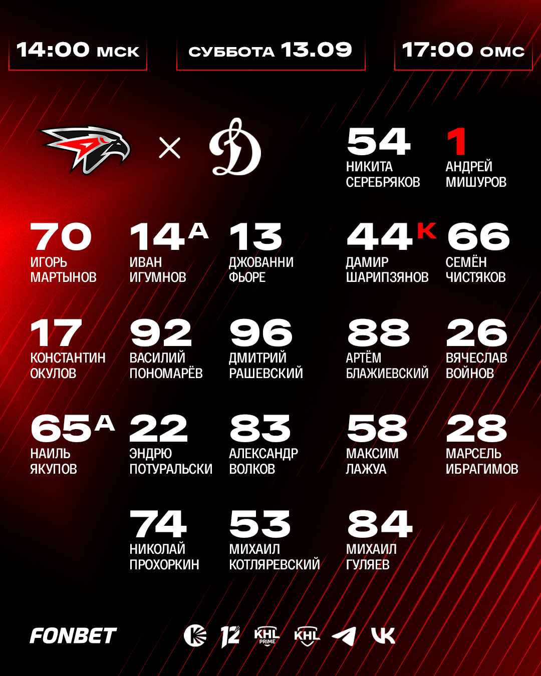 Состав «Авангарда» на домашний матч против московского «Динамо»