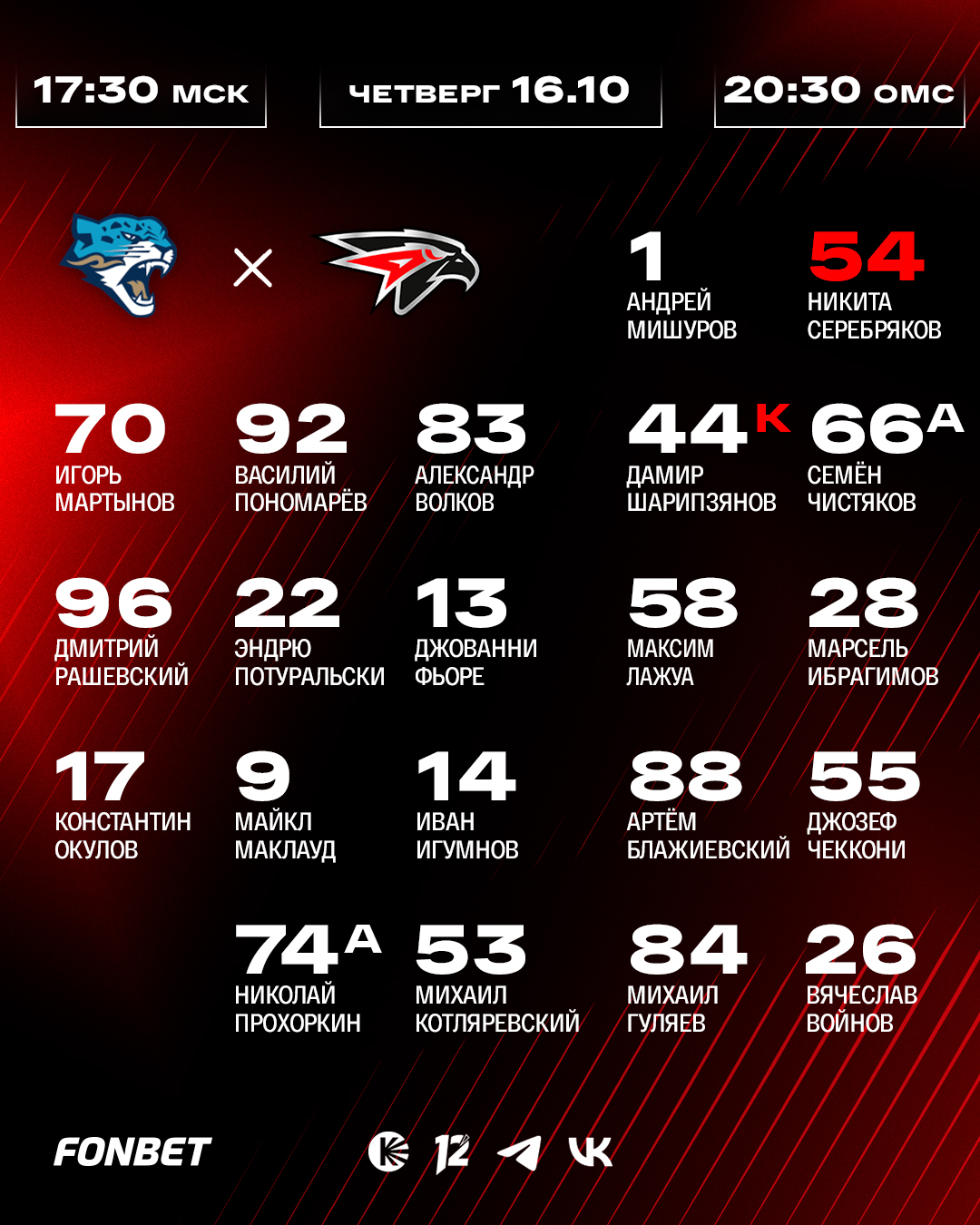 Состав «Авангарда» на выездной матч против «Барыса»
